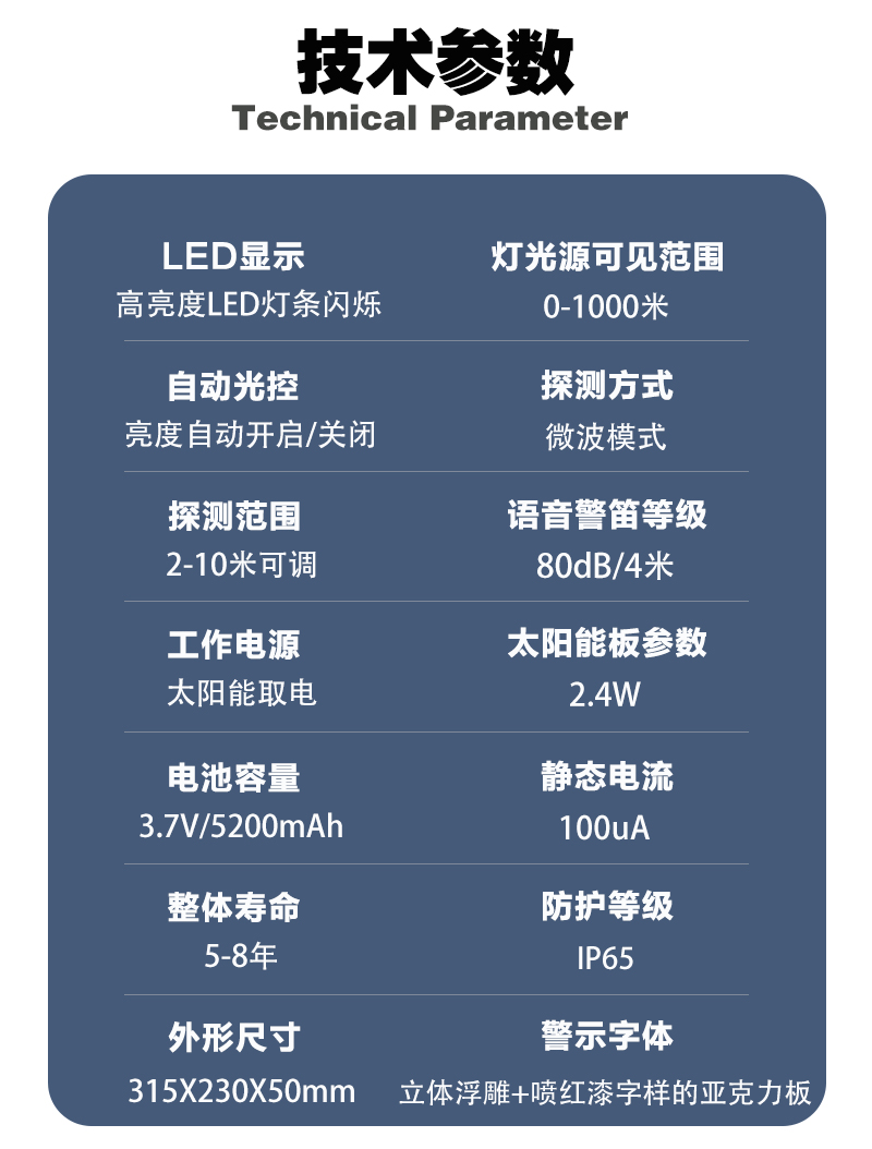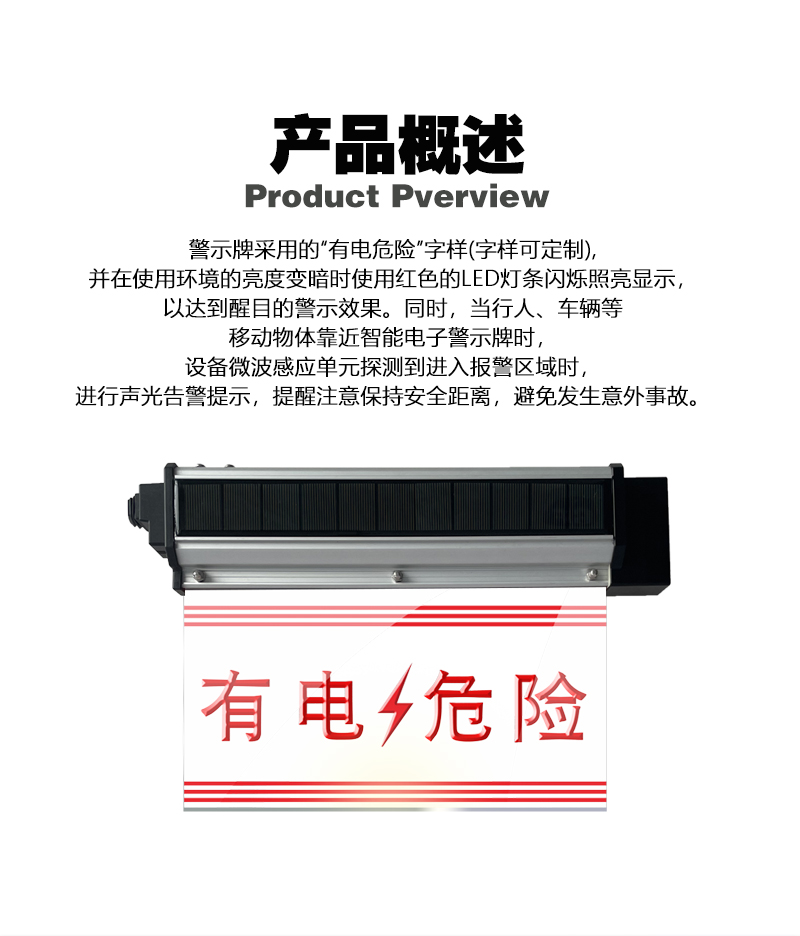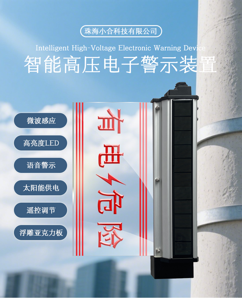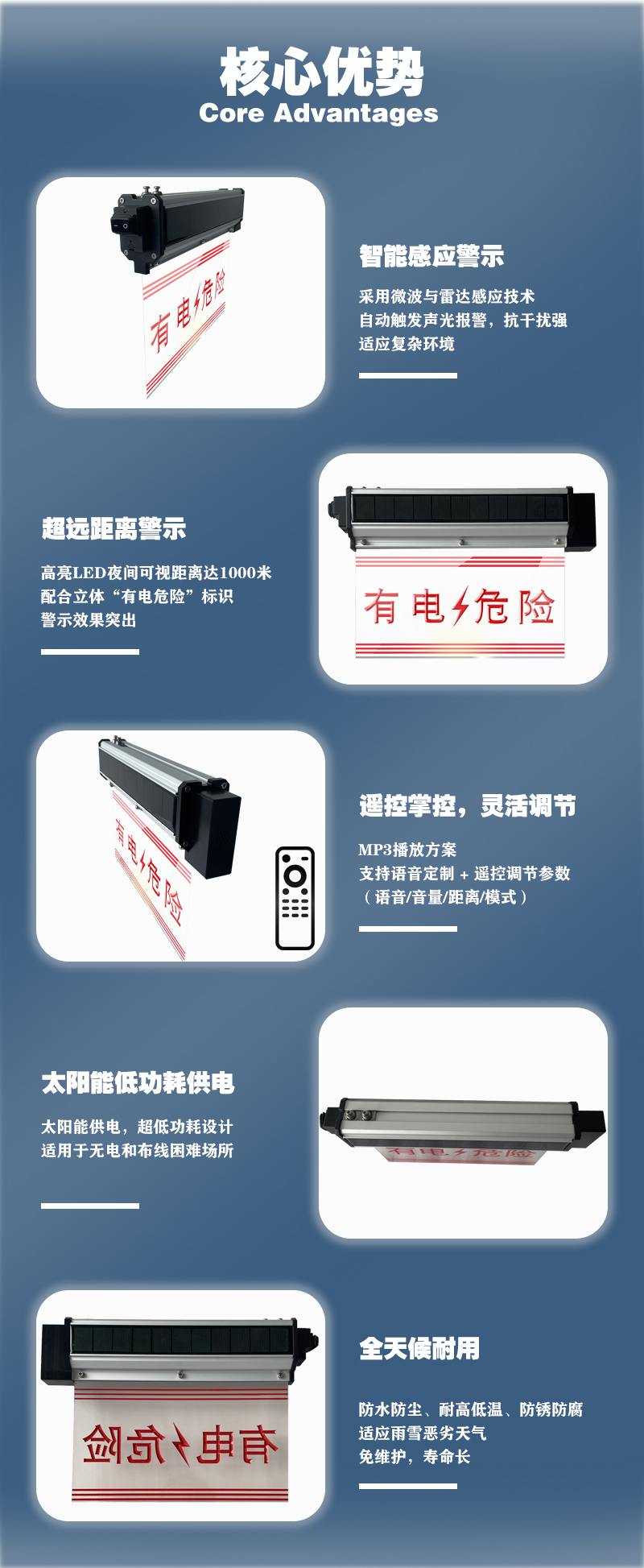 本产品采⽤⾼性能、超低功耗定频微波雷达感应技术,集成核⼼算法、有效解决同频⼲扰、带外阻塞以及环境⼲扰等问题,⼤⼤提⾼了模块的实⽤性与可靠性。智能⾼压电⼦警示装置安装在室外环境的0.4kV~220kV输配电线路及变压器台区等各类电⼒环境上,太阳能取电,⽆需另加外置电源。当⾏⼈、⻋辆等移动物体靠近智能电⼦警示牌时,设备微波感应单元探测到进⼊报警距离时,进⾏声⾳告警提示 ,提醒注意保持安全距离,避免发⽣意外事故。可遥控调节语⾳、⾳量、感应距离等各种参数,⽅便便携,实⽤性强。