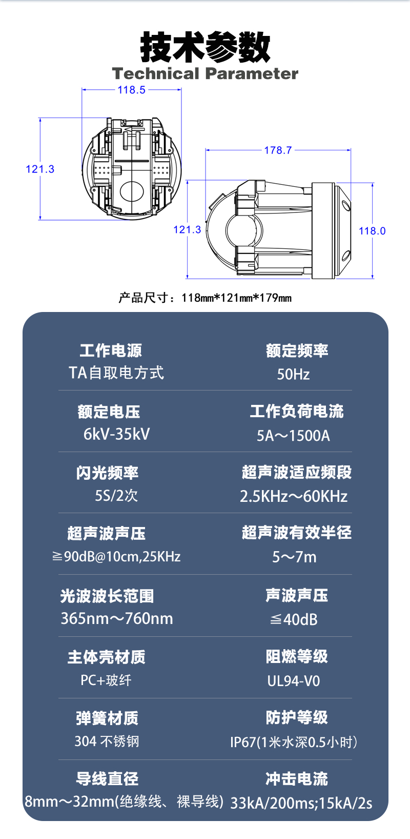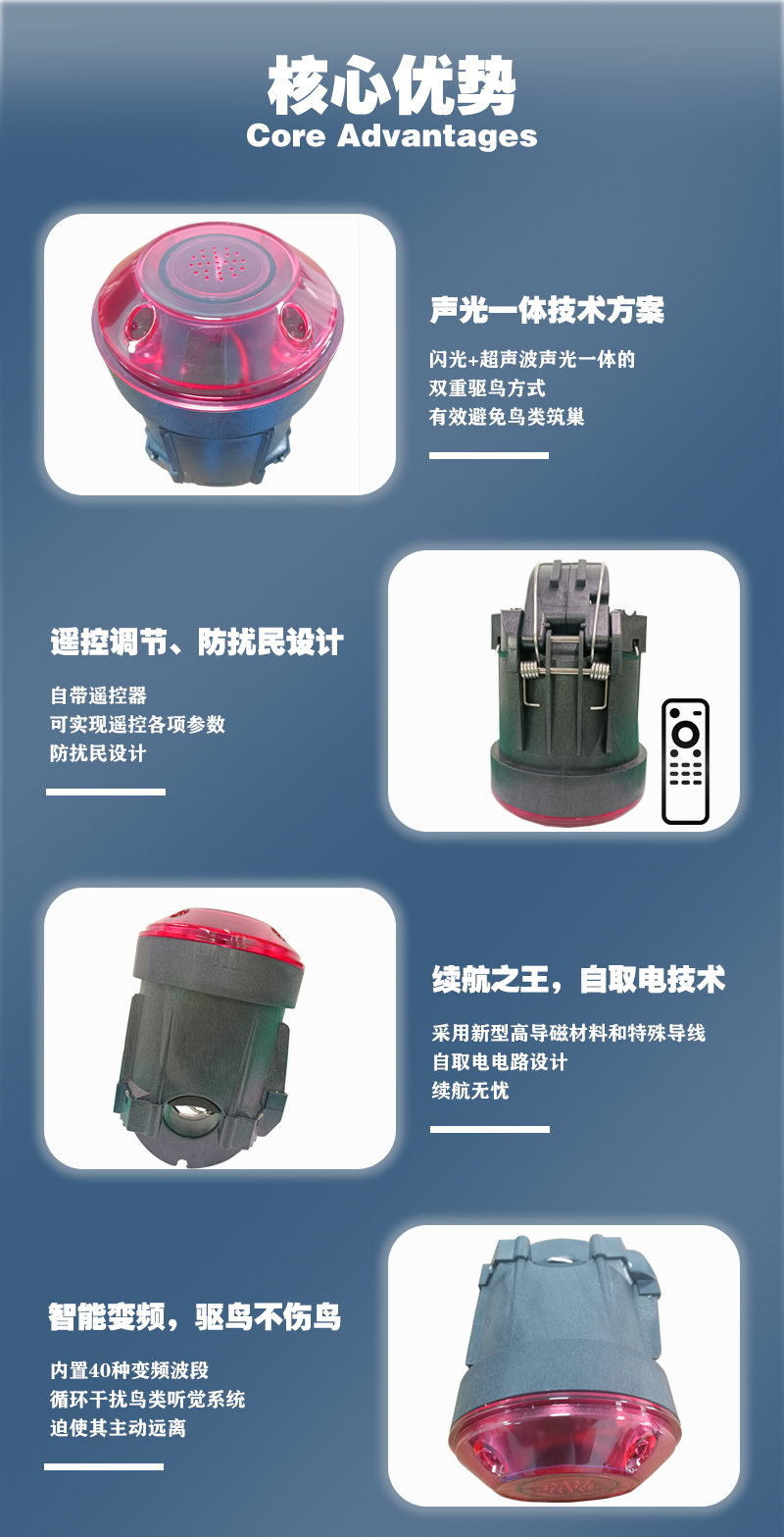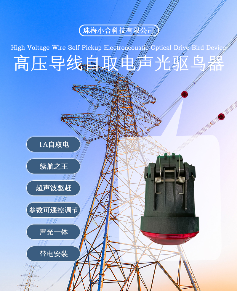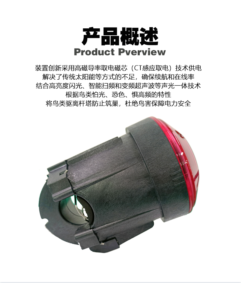 装置创新地使⽤⾼磁导率性能的取电磁芯 作为驱⻦器的电源解决⽅案,摆脱了类似产品 依靠光照、 太阳能取电等的先天不⾜之处,利 ⽤CT感应⼩电流⾃取电技术⽅案,完全满⾜输 配电线路的要求, 确保装置运⾏的续航⼒、在 线率,使得该产品的⼴泛上线成为可能。以新 型声光⼀体⾃取电超声波治理⽅式 对⾼压线路 进⾏⻦患治理,充分根据⻦类怕光、恐⾊、⾼ 频刺激的特性,将其驱赶于杆塔之外防⽌筑巢, 以达到杜绝⻦害,确保电⼒安全运⾏的⽬ 的。充分利⽤⾼亮度闪光、⾼智能的扫频模 式、 不断变换频率的超声波驱赶技术等⽅式相 结合的智能驱⻦⽅式, 将其驱赶于杆塔之外防 ⽌筑巢,以达到杜绝⻦害,并⽀持不停电安装。